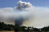 From Highway 101 a black plume of smoke hangs over the eastern hills in an otherwise cloudless sky. To the southeast of the blaze, where the wind has dragged the smoke, a white haze hangs over the hills.