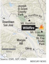 If the fire does grow to 30,000 acres, about the size of San Francisco, it would be one of the largest fires in Santa Clara County history. But it likely won't destroy any homes, Kemper said, because the wind is fanning it the southeast. To the north, homes abut the park's entrance. One structure, described as an outbuilding, has been destroyed so far.