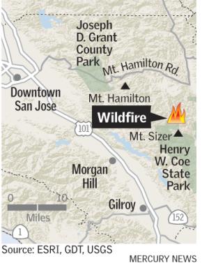 The fire is burning about 10 miles from the Lick Observatory on Mount Hamilton, according to a fire spokesman. But the observatory is not in danger.