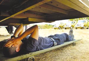 County, rests on a cot underneath a fire truck in the staging area at