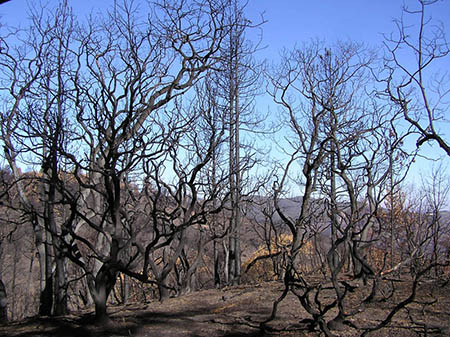 I'll use the term "forests" here in a loose sense, meaning any assemblage of trees rather than forest trees in the narrow sense, of which Coe has only Ponderosa Pines (Pinus ponderosa), and these only rarely in dense enough assemblages to be worthy of the "forests" moniker sensu strictu. The more inclusive term "woodland" is too inclusive for our purposes: it also includes the chaparral. The tree-dominated communities of Coe will be the slowest to recover, and in some cases might not recover at all. Coe's ponderosas, probably relicts of a much wider distribution during the last Ice Age, are of greatest concern.