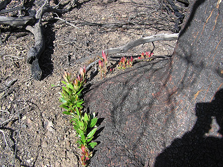 Chamise has two strategies for recovery: resprouting and seed germination. The roots, little scorched by the quick burning fire, store abundant supplies of energy and in addition, form a burl at the crown, a knotty, gnarl of wood at the base of the plant that enlarges with time and, apparently, with each fire the shrub has experienced. From the burl, new green growth will emerge in weeks, even if there is little or no rain. In the first year, you can expect that these new stems will be one to two feet high, probably depending on rainfall and the fertility of the soil. In four years, most of the burnt stems of the Chamise will have been hidden by the new growth, and many visitors will not notice the continued presence of charcoal stems. Note that while stump sprouting occurs abundantly in Chamise after a fire, it does not need a fire to stump sprout. You can achieve the same result by lopping off all the stems down to the base.