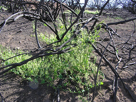 Before the fire, the vines climbed to the light through the network of chaparral stems in winter and spring, sometimes almost smothering the shrubs on which they were supported, before the leaves and stems shrivel to a mere trace by early summer. After a fire, they are all the more conspicuous spreading over the ashy ground with little or nothing to attach their tendrils to.