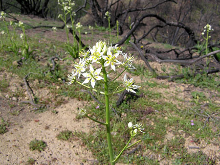 Some plants which appear to be fire-followers are not really — those which are sometimes called geophytes ("earth plants"), since they die back to and arise from underground storage organs — bulbs, corms, tubers — each year. One such is Fremont's Star-lily, (Zigadenus fremontii). It has been noted to be blooming in profusion among burned Chamise in March of 2008, seemingly where it was not growing before. Except that this plant is a perennial geophyte, and it takes many years of growth before these plants reach blooming size from seed — so its corms were present before the fire. Didn't notice them before? How often does anyone stroll through the middle of dense chaparral? I suspect that one way or the other, fire stimulated the bloom (whether from heat, improved light, and/or released nutrients from grey ash), but almost certainly all of the zigedene blooming were already growing beneath the Chamise shrubs, none merely resting dormant as seeds. — (3)