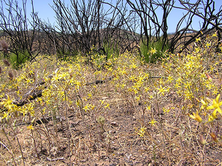 Bloomeria crocea — another geophyte — blooms vigorously after a fire