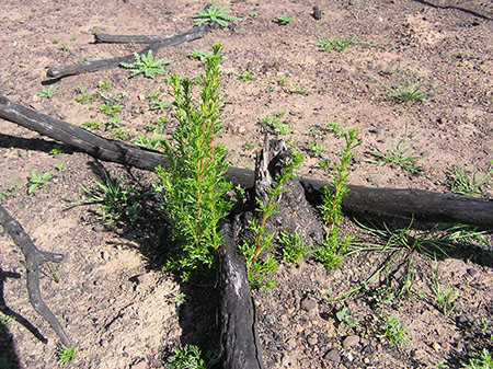 Many fine specimens grew along the crest and on the northeast-facing slopes of Blue Ridge, an area all burned. As the road along the crest of Blue Ridge was one of the firelines for holding the fire, it is possible that most of the flames that blazed among the pines there were low-intensity backfires set by the crews to remove the fuel before the advancing wildfire could reach the trees and set alight their crowns. Even so, ponderosas untouched by fire in the crowns could still die. Even in low intensity prescribed burns such as took place around, north, and west of the Monument on Pine Ridge in the 90s, the scorching of needles and bark can put enough stress on a pine to make it more vulnerable to insect attack, for instance — especially if the winter rains are lower than average. The needles of pines which look little touched immediately after the fire turn brown and drop off from lower branches over subsequent weeks.