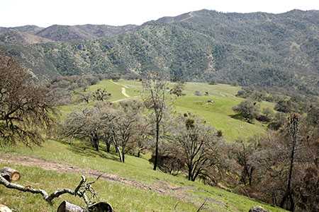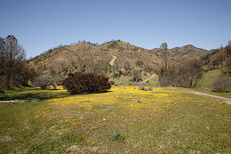 Robert Patrie, who had assisted George Gray in developing a fire-management plan for Coe before the Lick Fire, assures me that great care was taken by CalFire in combating the Lick Fire. Heavy equipment use was largely limited to existing park roads and trails (Blue Ridge Road, Poverty Flat Road, Kaiser Aetna Road, Center Flats Road, County Line Road, Scherrer Trail, Crest Trail, Divide Ridge Road, and Orestimba Creek Road). Large back-fires rather than heavy equipment were used to contain the burn. Some damage was done by bulldozers on the lower end of Willow Ridge Trail, in the Upper San Antonio Valley, and in the creation of a number of safety zones which were cleared to provide places of refuge for firefighters, but heavy equipment damage was kept to a minimum. And I was favorably impressed by statements made by State Parks people, assuring the public that while the aftermath may look bad, the long term effect of the actual fire will be positive, with no call for massive revegetation projects. — (4)
