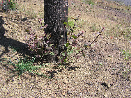 Other shrub species that are occasional in the Coe chaparral include Toyon (Heteromeles arbutifolia), Blue Elderberry (Sambucus mexicana), honeysuckle (Lonicera spp.), gooseberry (Ribes spp.), Chaparral Currant (Ribes malvaceum), California Sagebrush (Artemisia californica), Coyote Brush (Baccharis pilularis), Yerba Santa (Eriodictyon californicum), Scrub Oak (Quercus berberidifolia) and a number of others. These will all sprout from the roots and remaining stems, which is more the norm for Coe chaparral plants than the outright death of Buckbrush and Big-berry Manzanita.
